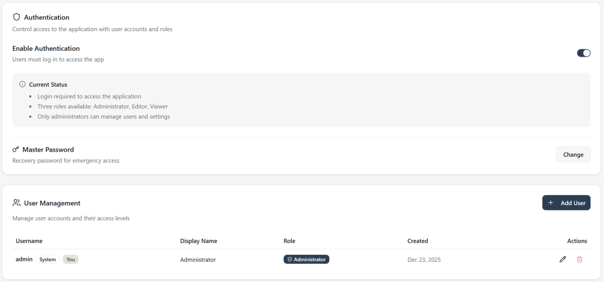 Settings: Configure database location, manage backups, set up authentication, and manage users.