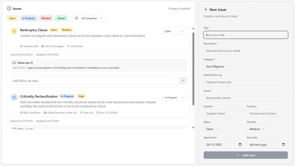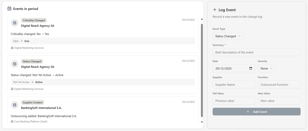 - Critical Functions - Only appears for critical suppliers, tracks risk assessments, audits, and regulatory notifications
